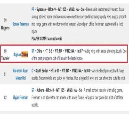 知名模擬選秀網站NBA Draft Room公布了最新2027年模擬選秀榜單,預測張博源次輪第60順位被雷霆選中,這是後者首次進入主流模擬選秀網站的榜單。