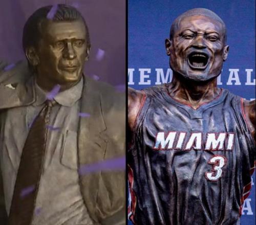 雕像的造型是萊利高舉右拳,這是上世紀80年代“Showtime”時期洛杉磯湖人隊的經典定格——示意“魔術師”約翰遜把球傳給賈巴爾完成標誌性的天勾。雕像不僅還原了西裝造型,還加入了鱷魚皮腰帶等細節。
