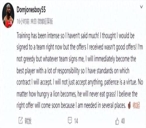 瓊斯對此回應,在社媒發了一段話:“訓練強度很大,所以我沒怎麽說!我本以為現在能簽上一支球隊,但收到的報價都不理想!我不是貪心的人,但無論哪支隊伍簽下我,我都會立刻成為最有責任感的頂尖球員,所以我對合同標準很挑剔。我絕不會隨便接受任何條件,耐心是一種美德。獅子再餓,也絕不會吃草!我相信合適的報價很快就會到來,因為我有多方需求。”