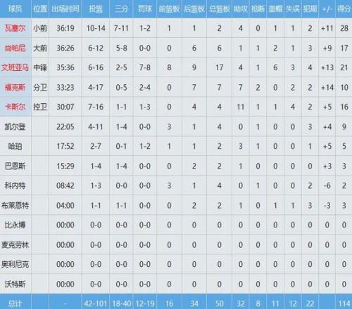 文班亞馬(23屆狀元)防守端影響力巨大,屢次讓21屆狀元坎寧安吃癟,後者全場出手26次僅中5球得到16分6板10助2斷3帽,正負值-18全隊最低。