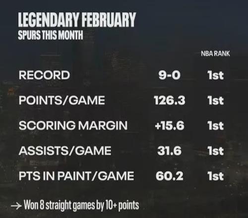 馬刺當前勢頭極佳,今年二月份至今未嚐敗績,9勝0負,並且場均得分(126.3)、場均淨勝分(15.6)、場均助攻數(31.6)、場均禁區得分(60.2)均高居聯盟榜首,對於他們而言一切皆有可能。