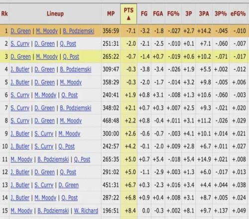 在勇士三人組中,追夢、波傑、穆迪的組合一起出戰將近357分鍾,這一時長排名隊內第四(前三的三人組中至少有庫裏和巴特勒其中一人),但三人同時在場時,勇士每百回合要淨負7.1分,在隊內斷層式墊底。