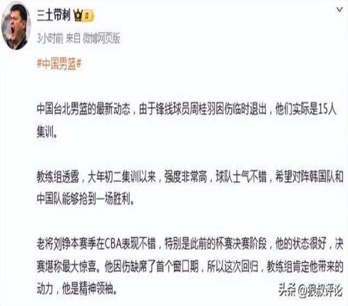 北京時間2月24日,根據中國台北媒體的報道,鋒線球員周桂羽因傷臨時退出,隻有15人參加了集訓。