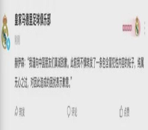 直到壓力無法回避,皇馬終於“行動”了。2月22日晚,皇馬官方微博發布了一則赫伊森的“道歉聲明”,全文中文,核心意涵隻有四個字:“無心之過”