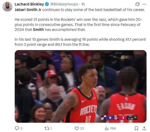 火箭記者蘭德裏-賓克利寫道:小賈打出了他職業生涯最出色的投籃表現,這場比賽他拿到31分,最近兩場比賽他都拿到20+,這是他自2024年2月24日-26日以來首次連場20+,也就是731天後首見。