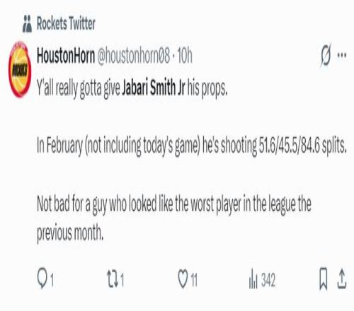 休媒:二月份小賈巴裏-史密斯,投籃命中率51.6%,三分命中率45.5%,罰球命中率84.6%,他一月份還被認為是最差的家夥,不得不說他有了巨大的進步。