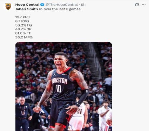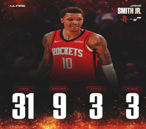 此役是小賈巴裏-史密斯的表現是火箭最佳,全場比賽33分鍾,17中12,三分11中6,罰球2中1,拿到31分9籃板3搶斷3蓋帽,命中率70.6%,三分命中率54.5%,真實命中率69.2%,正負值+28。