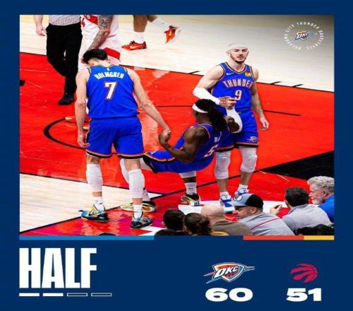 次節比賽,雷霆進攻火力升級首次單節得分35+,且限製猛龍比首節少得到13分,猛龍第二節單節不足20分。華萊士爆發前兩節7中7(三分3中3)狂轟17+6+4,外加卡魯索7中5得到14分,引領雷霆單節35-19淨勝16分,上半場結束雷霆60-51反超猛龍。猛龍前兩節比賽也有2人得分上雙,巴恩斯11分與巴雷特13分。