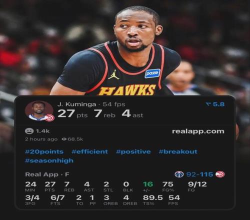 迎來老鷹生涯首秀的庫明加表現十分搶眼,替補出戰約24分鍾,投籃12中9,其中三分4中3,罰球7中6無比高效砍下27分外加7板4助2斷全麵數據,正負值+16,幫助新東家119-98輕鬆擊敗奇才。