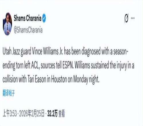 北京時間2月25日,據名記Shams報道,在接受進一步檢查後,爵士球員小文斯-威廉姆斯確診為左膝前交叉韌帶(ACL)撕裂。這一傷勢不僅讓威廉姆斯直接報銷2025‑26賽季,按照這類傷病的常規恢複周期,他2026‑27賽季的大部分時間也很可能無法出戰。