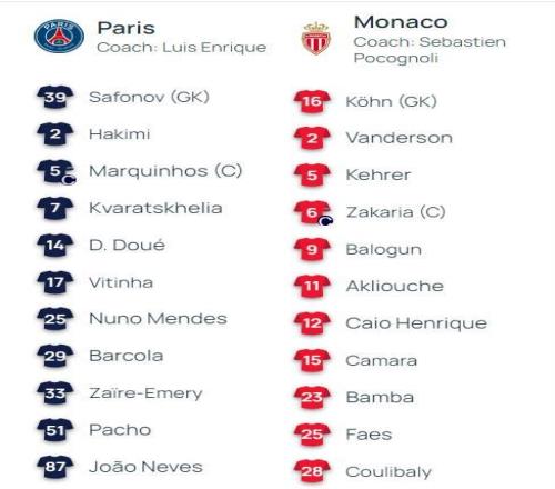 北京時間2月26日4:00,歐冠淘汰賽附加賽次回合,巴黎聖日耳曼坐鎮王子公園體育場迎戰摩納哥,本場主裁判為伊斯特萬-科瓦奇,首回合巴黎客場3-2取勝,賽前雙方首發出爐。
