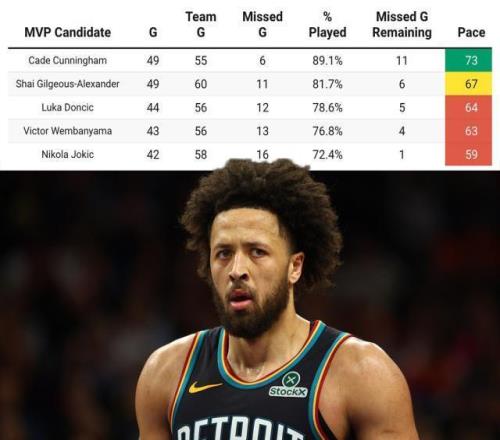 美國博彩公司的賠率顯示,坎寧安獲得MVP的概率正在不斷增大,而過去一周看好他贏得MVP的玩家超過看好其他球員的總和。這不僅僅是因為坎寧安的出色表現和活塞聯盟第一的戰績,還因為其他MVP大熱門正麵臨出勤不達標的風險。
