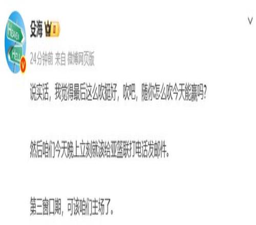 籃球解說員殳海表示:咱們今天晚上立刻就該給亞籃聯打電話發郵件。第三窗口期,可該咱們主場了。