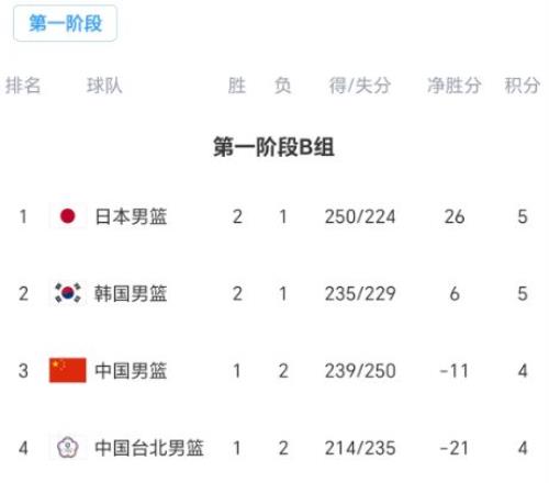 B組三輪過後,日本隊、韓國隊都是2勝1負,都在本輪遭遇首場敗仗,中國隊、中國台北隊都是1勝2負,都在本輪取得首場勝利,最新積分榜如下: