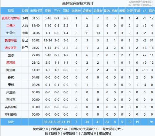 森林狼:愛德華茲31分3板5助、迪文岑佐18分3板4助2斷、麥克丹尼爾斯12分7板2助3斷、道蘇姆12分2板1助、裏德11分7板2帽、蘭德爾4分3板6助、戈貝爾3分13板1助3帽