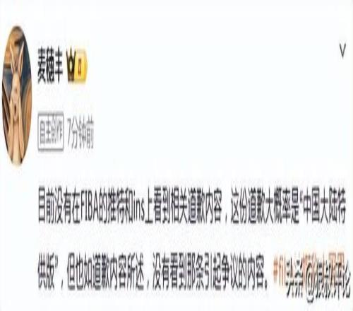 媒體人“麥穗豐”發文點評:目前沒有在FIBA的推特和ins上看到相關道歉內容,這份道歉大概率是“中國大陸特供版”,但也如道歉內容所述,沒有看到那條引起爭議的內容。