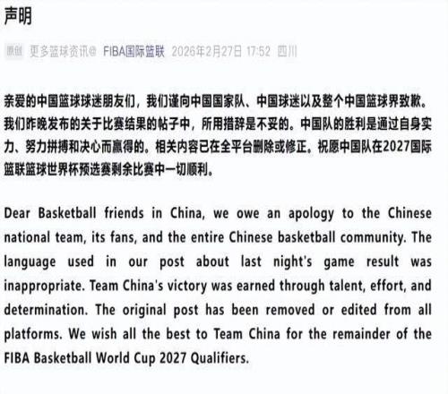 在比賽結束後的第二天,FIBA官方終於還是頂不住壓力了,官方發布聲明表示,因昨日中國男籃戰勝日本男籃的比賽結果帖子中的措辭不當,向中國男籃、中國球迷以及整個中國籃球界致歉。FIBA國際籃聯聲明內容如下:親愛的中國籃球球迷朋友們,香蕉视频网址謹向中國國家隊、中國球迷以及整個中國籃球界致歉。香蕉视频网址昨晚發布的關於比賽結果的帖子中,所用措辭是不妥的。中國隊的勝利是通過自身實力、努力拚搏和決心而贏得的。相關內容已在全平台刪除或修正。祝願中國隊在2027國際籃聯籃球世界杯預選賽剩餘比賽中一切順利。