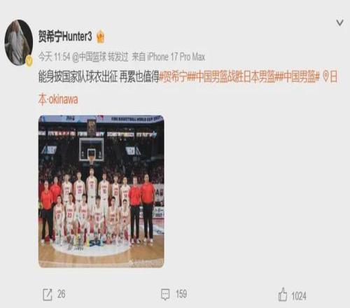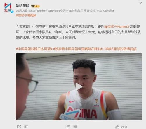 賽後接受采訪時,賀希寧動情落淚,表示這場比賽對他意義重大,希望可以讓大家重新喜歡上中國籃球。