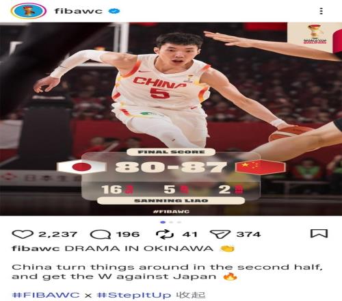 賽後,FIBA(國際籃球聯合會)世界杯社交媒體官方賬號寫道:“衝繩神劇本!中國男籃從日本偷走一場勝利。”(China with a sneaky win over Japan),“Sneaky”一詞隱含“鬼祟、卑鄙”的貶義,被質疑暗指中國隊勝之不武,引發全球球迷強烈不滿。
