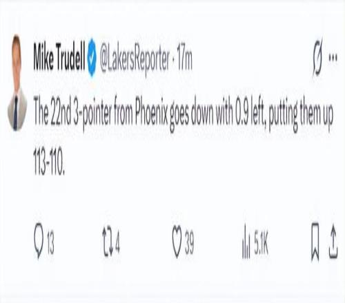 湖人隊記邁克-特魯戴爾:在終場前0.9秒湖人居然讓殘陣太陽命中第22個三分球。