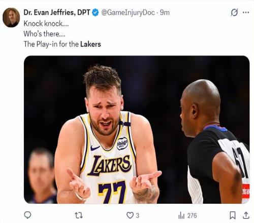埃文-傑裏弗斯曬出東契奇攤手的一幕寫道:敲門,誰在那兒?湖人的季後賽對決嗎?