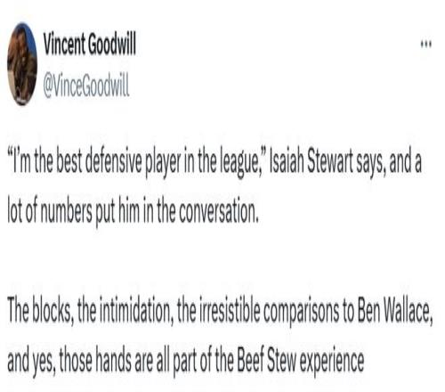 北京時間2月28日,活塞內線以賽亞-斯圖爾特認為,自己已經坐穩了NBA頂級防守球員的位置,同時也幫助球隊拿到了聯盟第一的戰績。“我就是聯盟裏最好的防守球員。”斯圖爾特在接受ESPN記者古德維爾采訪時說道。在不少人眼中,他就是活塞新一代的大本。