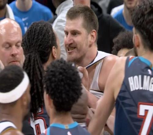 比賽末節,約基奇這賽季的一個名場麵出現。多爾特的一個壞動作將約基奇撞倒,約基奇起身之後馬上急眼找多爾特要說法,傑林追上來揪住約基奇的球衣拉扯,約基奇呲著牙怒目而視,場麵一度非常嚇人。