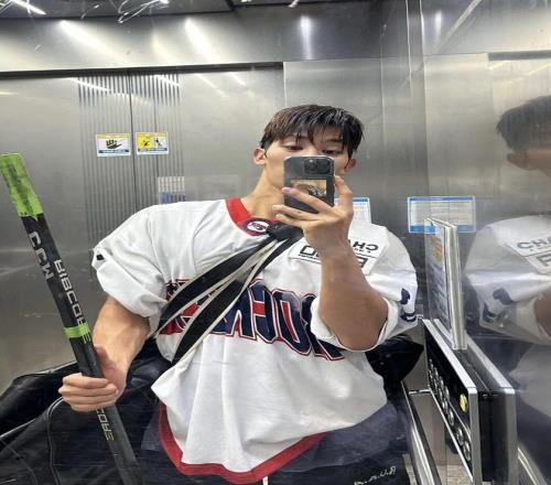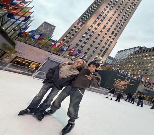 樸元彬與好友同行,簡約黑色外套內搭中式盤扣上衣,沉穩中藏著東方雅致。下身搭配隨性牛仔褲,利落又自在,於冰場中自成格調。