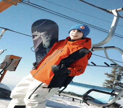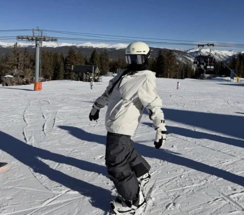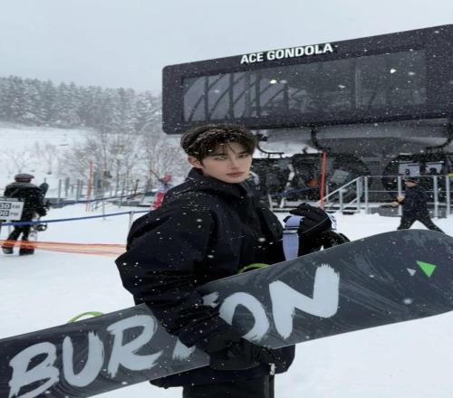 張樂康身著牛仔雪服,內搭針織毛衣,隨性又不失質感。同色係棕色雪靴與手套相互呼應,將冬日運動穿搭的舒適與格調完美融合。
