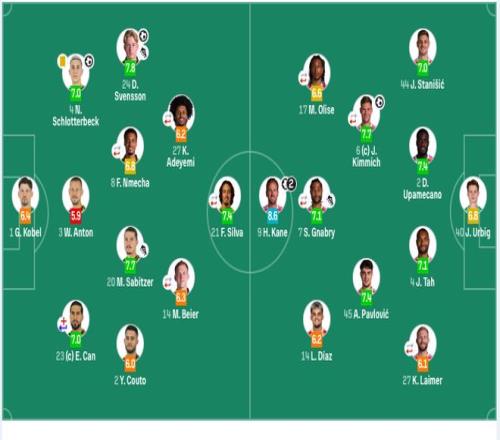 拜仁慕尼黑首發:40-烏爾比希、2-於帕梅卡諾、4-塔、44-斯坦尼西奇、45-帕夫洛維奇、6-基米希(90’8-格雷茨卡)、7-格納布裏(62’10-穆西亞拉)、27-萊默爾(90’20-比朔夫)、14-迪亞斯、17-奧利塞(90’3-金玟哉)、9-凱恩。