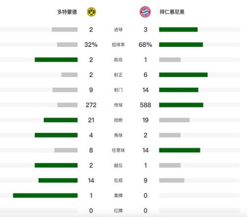 北京時間3月1日淩晨,德甲第24輪迎來國家德比,多特蒙德坐鎮主場迎戰拜仁。第26分鍾,施特羅貝克頭槌破門,這是多特蒙德的第一次射門。第54分鍾,格納布裏助攻凱恩破門。第70分鍾,施特羅貝克送點,凱恩點射梅開二度。第83分鍾斯文鬆扳平比分,4分鍾後基米希絕殺。最終,總身價9.6億的拜仁客場3-2戰勝多特蒙德,終結大黃蜂的16輪不敗,在還剩10輪的情況下,領先多特蒙德11分。