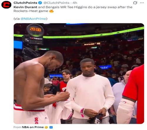 這場比賽後杜蘭特與NFL球星泰-希金斯互換了球衣,杜蘭特還在自己的球衣上進行了簽名。雖然火箭隊輸球了,可杜蘭特這場比賽卻可以昂首離開,他的個人表現非常出色。