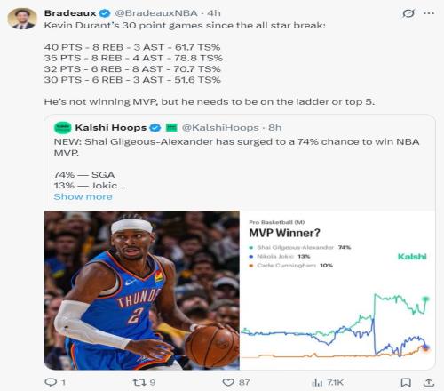 休媒Bradeaux寫道:雖然杜蘭特無法贏得MVP,但他至少應該進入MVP前五才對。