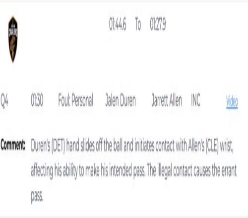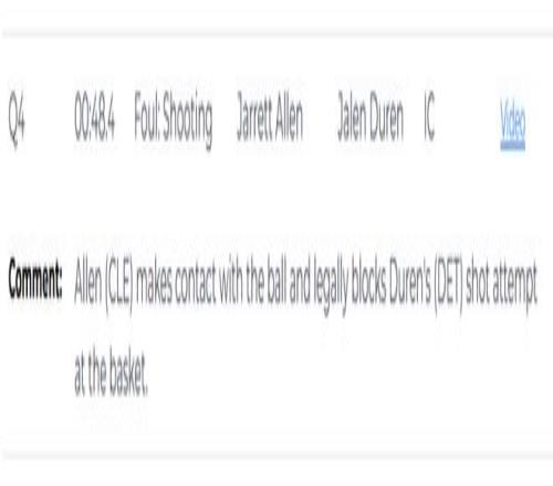 第一次是漏判,發生在距離第四節結束還有1分30秒。杜倫的手從球上滑開,主動接觸到了艾倫的手腕,影響了他完成預期傳球的能力。這次非法接觸導致了艾倫的傳球失誤。這本該吹杜倫防守犯規,但裁判沒有響哨,這是一次漏吹的防守犯規,並導致騎士失誤,對手搶斷得分。活塞獲利,騎士吃虧。