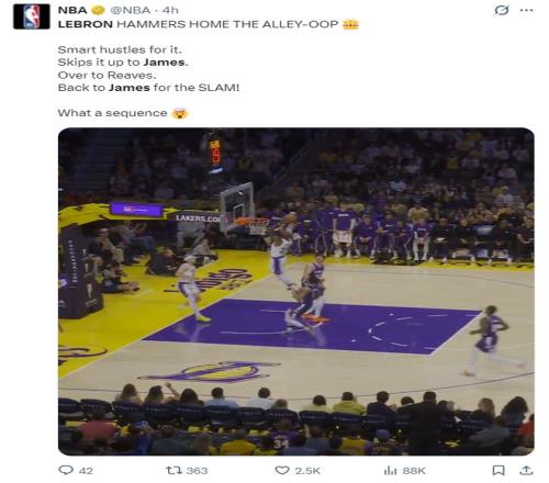 這場比賽41歲的勒布朗還完成了一個超級霸氣的空中接力暴扣,NBA官方寫道:勒布朗空接暴扣,霸氣側漏!戴上皇冠。