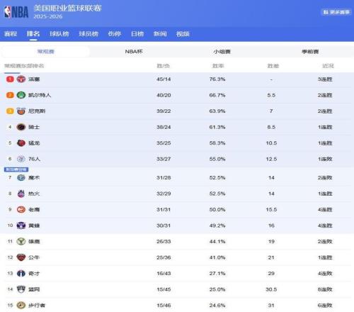 東部相對來說,競爭壓力更大!活塞隊一枝獨秀,45勝14負,領先第2的綠軍5.5場勝負差,基本上坐穩了東部第1的位置!綠軍40勝20負,領先第3的尼克斯1.5場,第2的席位還有懸念,而騎士隊,試圖衝擊第3名!
