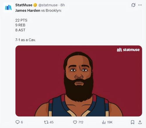 哈登加盟騎士後場均33分鍾,19.3分5.1籃板8助攻,命中率50%,三分命中率50%,罰球命中率81%,在他登場的比賽中騎士7勝1負,哈登一下就成為了新的克村領頭羊。
