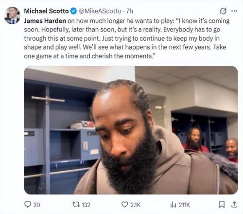 哈登賽後也談到自己的傷情,他表示:不考慮手術是為了盡早複出,一開始手指的確很疼,我連球都抓不住,我一直在冰敷。周六感覺好一些就去了單獨的訓練。這場比賽我失誤太多了,還無法很好的控製住球,隻能讓拇指慢慢恢複。