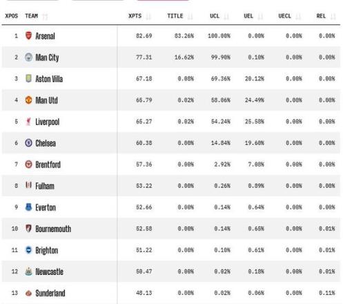 隨著英超第28輪比賽的結束,英超積分榜也發生了一定的變化,其中最受關注的自然還是曼城和阿森納之間的冠軍之爭。本輪比賽阿森納是力克切爾西拿到了比賽的勝利,曼城雖然也取勝但仍然在積分榜上落後阿森納5分。數據分析機構在本輪比賽全部結束後更新了英超的奪冠概率,中阿森納83.26%領跑,曼城16.62%,維拉0.08%,曼聯和利物浦0.02%,這也是有可能奪冠的全部球隊。