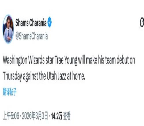 北京時間3月3日,據名記Shams報道,華盛頓奇才隊控球後衛特雷-楊預計將在周五對陣猶他爵士的比賽中完成新球隊首秀。特雷-楊自2025年12月28日起因膝蓋與股四頭肌傷勢一直缺陣。他是在2026年2月交易截止日前被交易至奇才隊的。