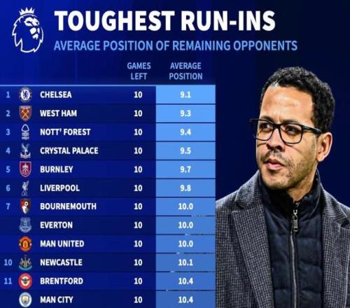 北京時間3月3日,德轉統計出了本賽季英超剩餘10輪各支球隊將會遭遇的對手在聯賽中的平均排名,切爾西最後10個對手平均排名9.1位,為所有球隊最高,而領頭羊阿森納剩餘9個對手的平均排名僅為11.6位,位列倒數第三。
