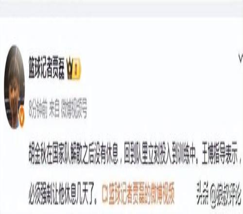 北京時間3月3日,根據籃球記者“賈磊”發文:胡金秋在國家隊解散之後沒有休息,回到隊裏立刻投入到訓練中。王博指導表示,必須強製讓他休息幾天了。