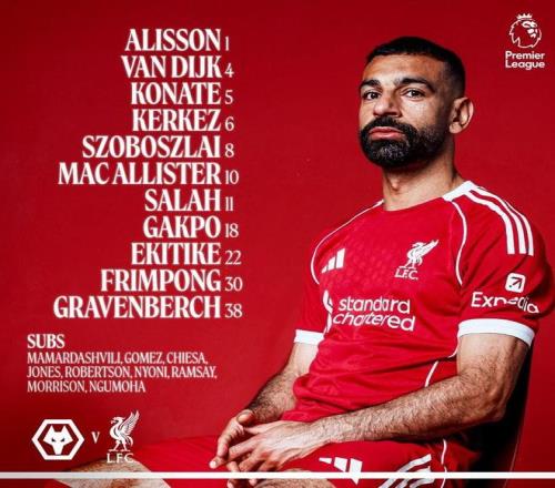 利物浦首發:1-阿利鬆、30-弗林蓬、4-範戴克、5-科納特、6-凱爾凱茲、38-赫拉芬貝赫、8-索博斯洛伊、10-麥卡利斯特、11-薩拉赫、18-加克波、22-埃基蒂克