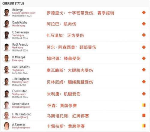 如果說巴薩傷病嚴重,那他們的競爭對手皇馬就是超級嚴重。周一晚主場0比1不敵赫塔費一役,懷森和卡雷拉斯均吃到黃牌停賽,馬斯坦托諾比賽結束前也拿到紅牌,可能停賽一到兩場。更嚴重的是帶傷堅持踢了幾十分鍾的羅德裏戈賽後被診斷右膝十字韌帶和外側半月板受傷,不僅本賽季提前報銷,還無法參加今年世界杯。