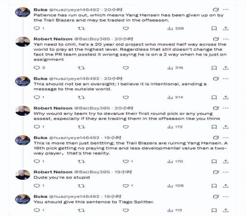 開拓者官方的錯誤,很快被一位名為Nelson的球迷指出,他寫道:“楊瀚森是下放發展聯盟,而不是發展聯盟雙向合同。”隨後,一位Buka的球迷與Nelson在評論區展開熱議。