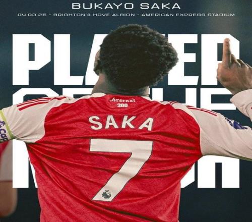 在今天淩晨進行的英超第29輪比賽中,阿森納客場1-0擊敗布萊頓,賽後,打入製勝進球的薩卡被阿森納官方評為本場比賽隊內最佳球員。