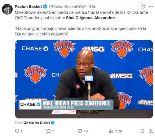 賽後邁克-布朗這樣評價SGA:他在讓裁判相信他造犯規成功這個方麵的確非常出色,聯盟裏沒有人能比得過他。(嘲諷亞曆山大是碰瓷王、罰球王)