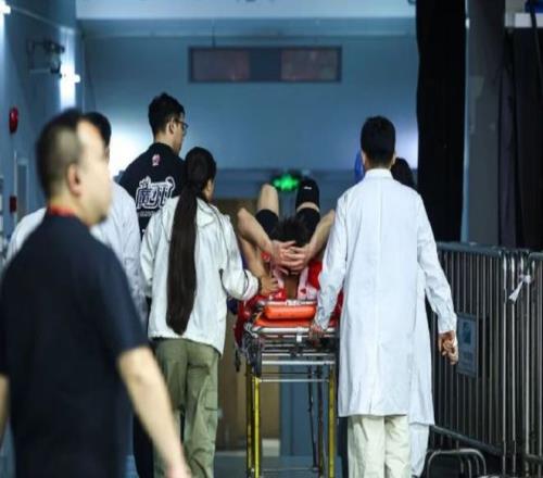 郭艾倫倒在地上,一邊捂著膝蓋,一邊流下眼淚,還用手拍擊地板,確實是很難受。此時廣州龍獅男籃的球員和教練都圍上來了,還叫了醫護人員上場。最終,郭艾倫被隊友抬上了擔架床,被醫護人員推出場,提前退賽。