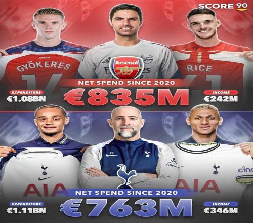 來自數據媒體Score90的統計,自2020年以來,阿森納在轉會市場引援共花費10.8億歐元,收入2.42億歐元,淨支出8.35億歐元;而熱刺共花費11.1億歐元,收入3.46億歐元,淨支出7.63億歐元。也就是說阿森納和熱刺兩支球隊在過去5年轉會費投入相差無幾,甚至熱刺還要多出3000萬歐元,但是他們的陣容反而變得越來越差,球隊如今更是連續兩個賽季都排名英超倒數,如果不是上賽季歐聯杯奪冠,甚至無法獲得歐冠名額。
