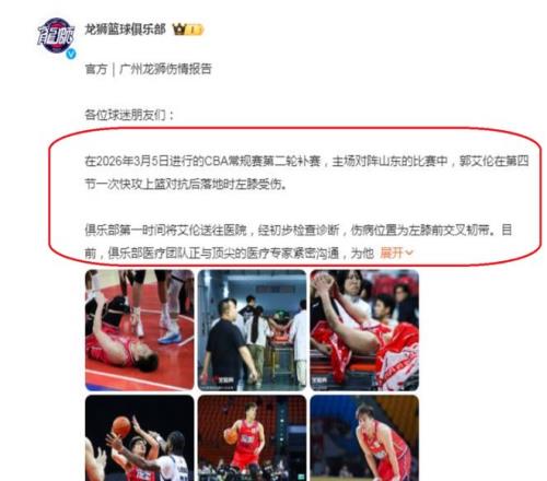 後來,廣州隊也是在第一時間公布了郭艾倫的傷情,廣州隊公告內容表示:郭艾倫傷病位置為左膝前交叉韌帶斷了,接下來,球隊會請專家製定康複方案,給郭艾倫一個最好的康複治療。